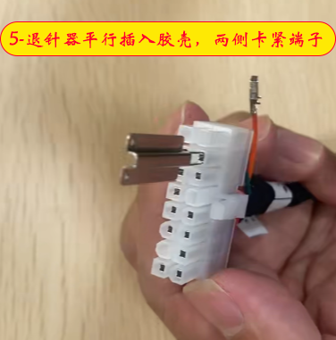 5、將退針器平行于膠殼插入孔,兩側(cè)卡住端子。